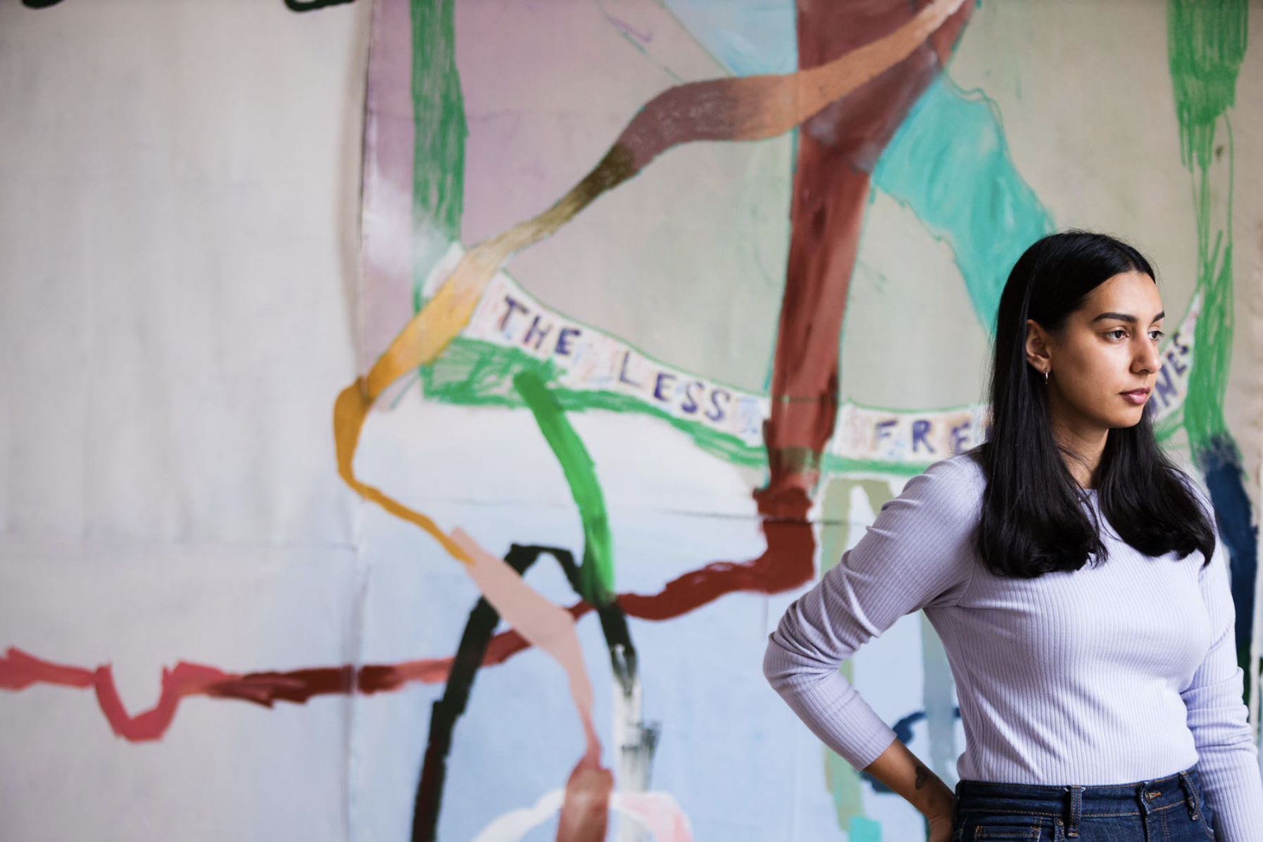 RUSSNA KAUR (b. 1991, Toronto, ON; lives and works in Vancouver) explores how the surface of a painting can reveal a narrative that addresses complex personal and cultural histories. Her large-scale and multi-surface paintings are developed through rigorous explorations of colour, text, digital sketches and mixed media.