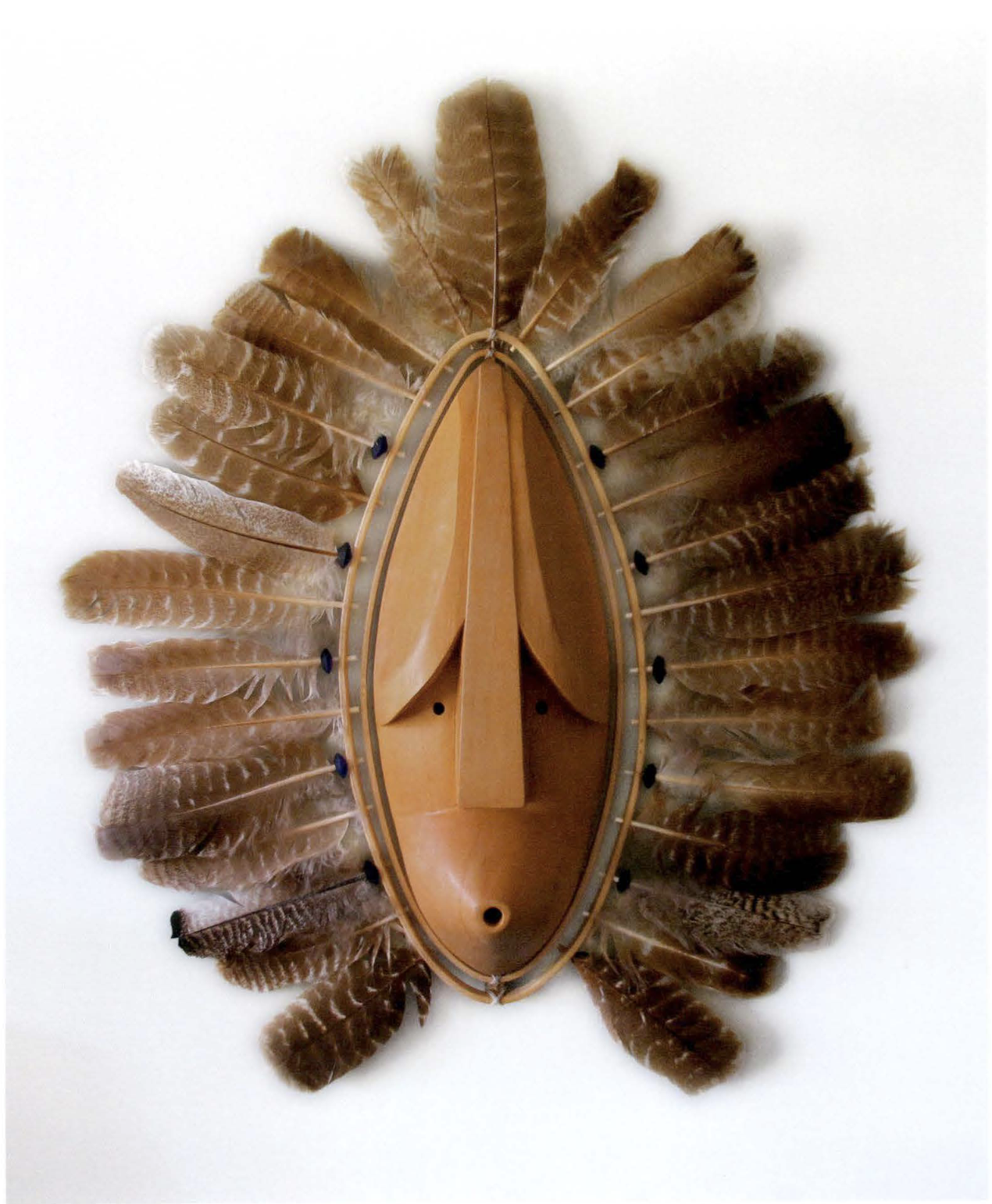 Alaskan artist Perry Eaton and Colin “began by speaking about one of Perry’s masks called “Yellow Singer,” carved from yellow cedar in 2004. “Yellow Singer” is a stylized bird with a mouth that looks as if it’s whistling and a halo of beautiful feathers. In shape, “Yellow Singer” echoes one of the masks acquired on Kodiak Island by French linguist and ethnographer Alphonse Pinart in 1871. These masks were transported back to France and eventually deposited by Pinart in the Chateau Musee in Boulogne-sur-Mer, France, where they are now on display.”