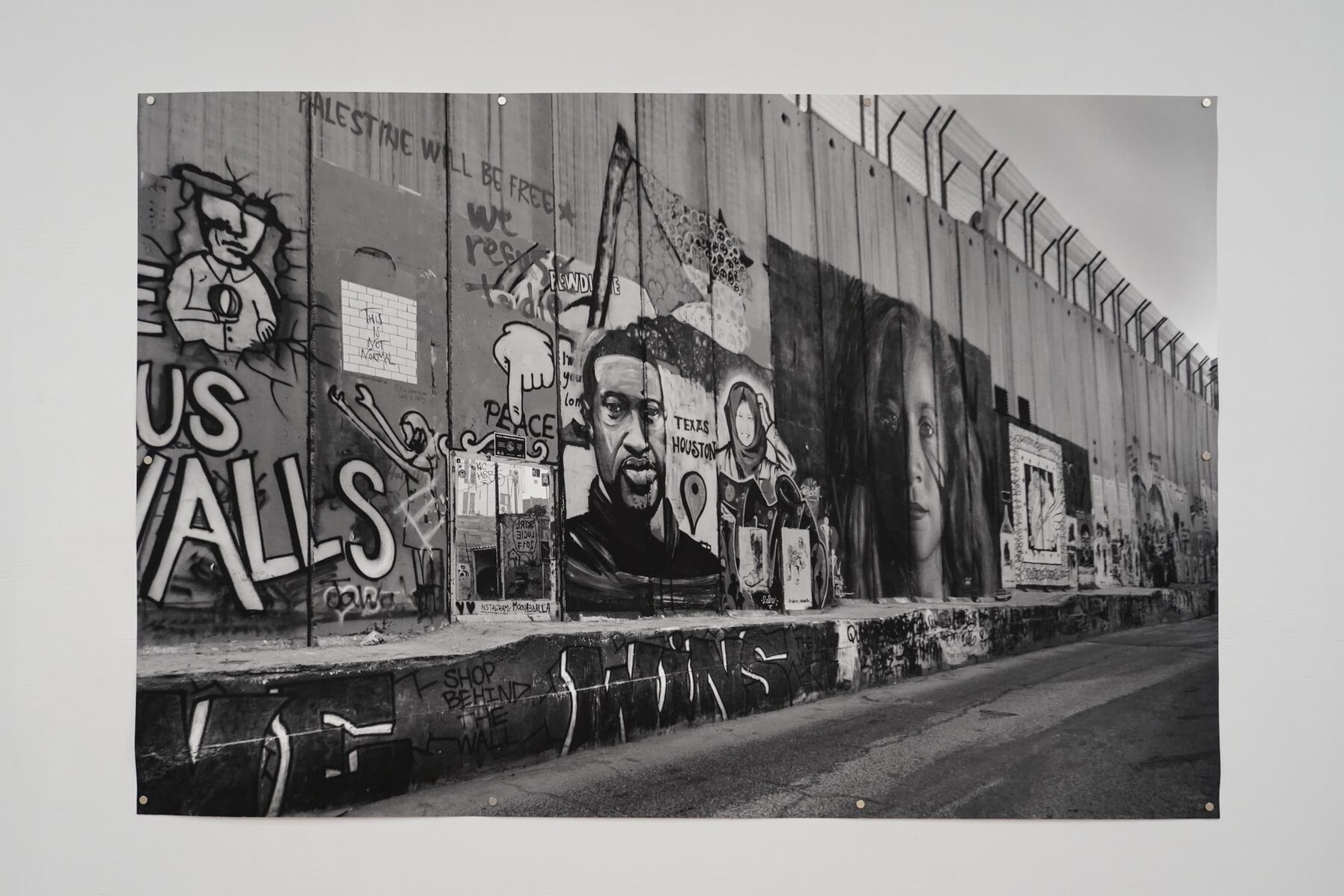 Watch tower, barricade, checkpoint, gunpoint, surveillance camera on camera, officer, wall, wall, wall, wall. The sound of a drone in the gallery instructs me on how the body constricts under hostile eyes.