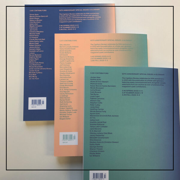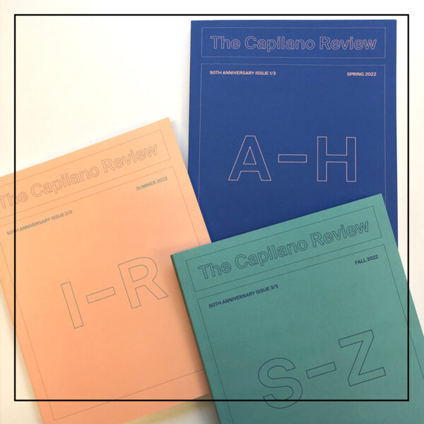 The Capilano Review celebrates its 50th anniversary in 2022 with the publication of a three-part experimental glossary featuring newly commissioned work alongside notable selections from our archive by over a hundred of the magazine’s past contributors.