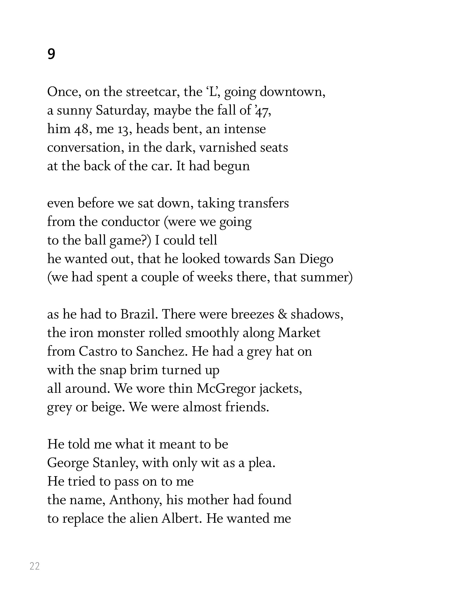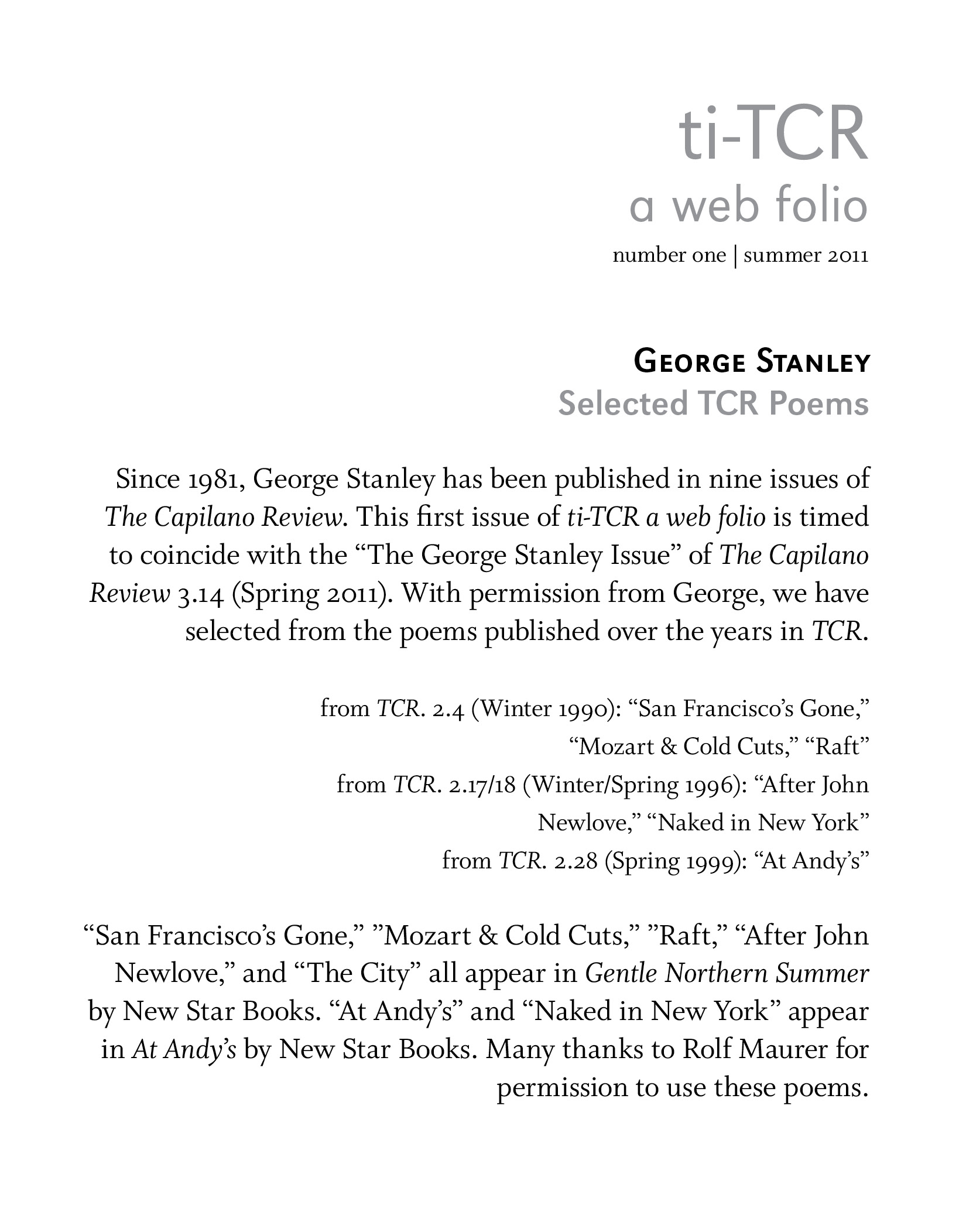Since 1981, George Stanley has been published in nine issues of The Capilano Review. This first issue of ti-TCR a web folio is timed to coincide with “The George Stanley Issue” of The Capilano Review 3.14, and includes a selection of poems published over the years in TCR.