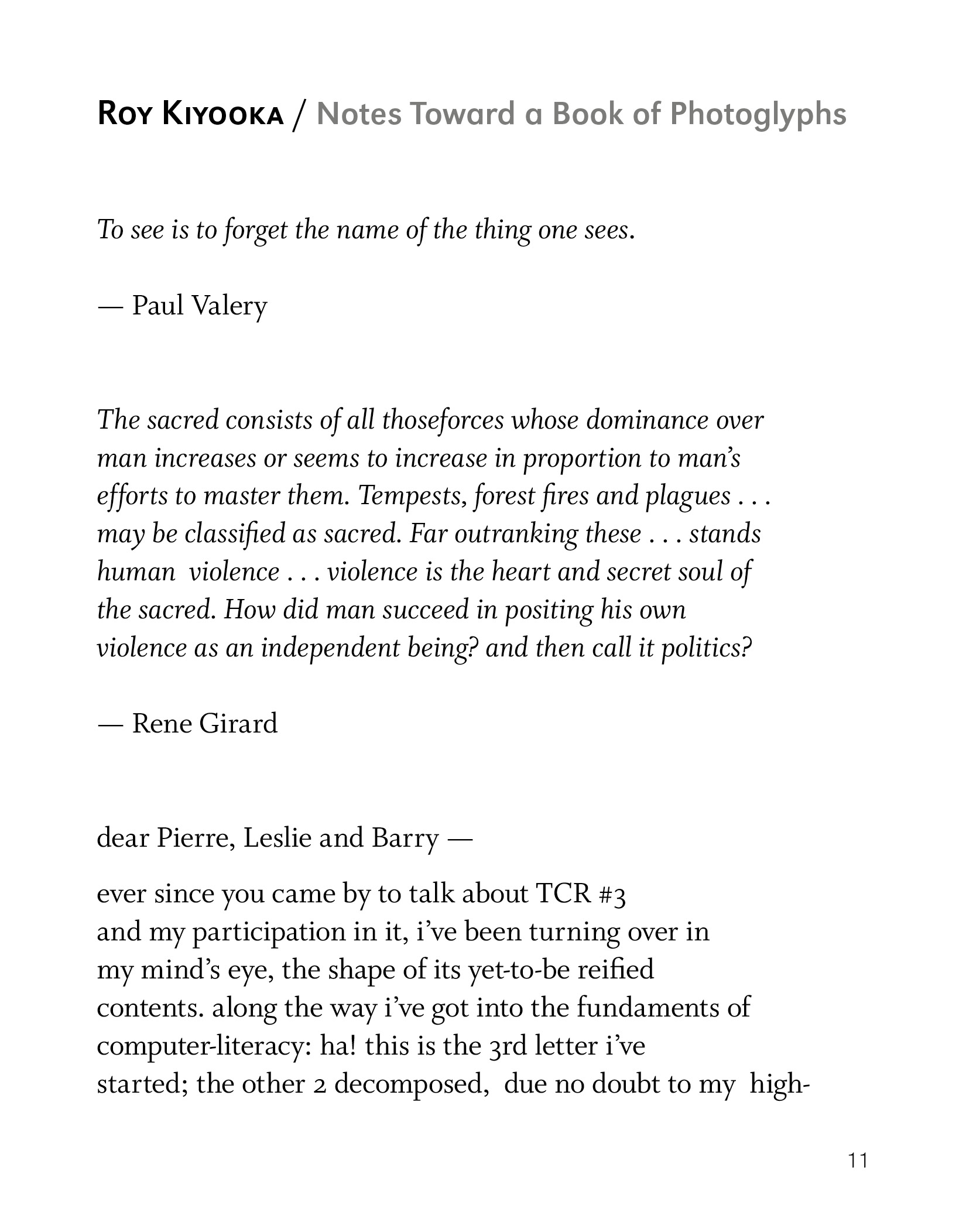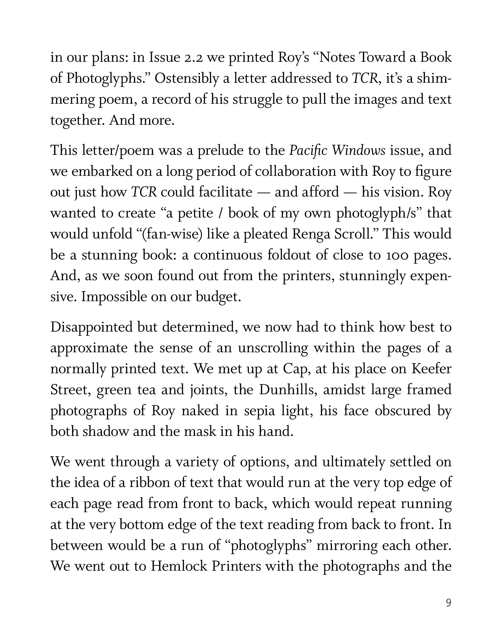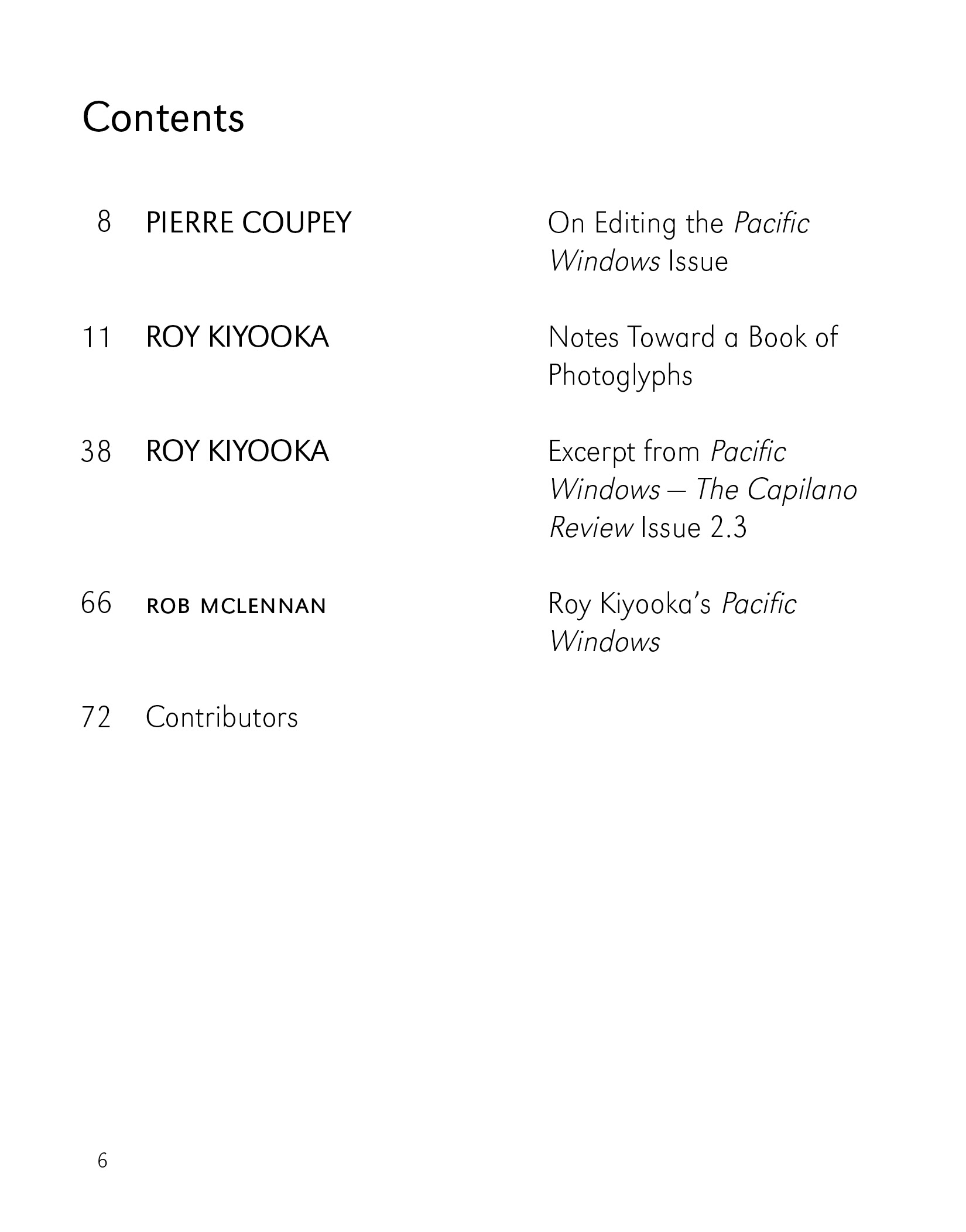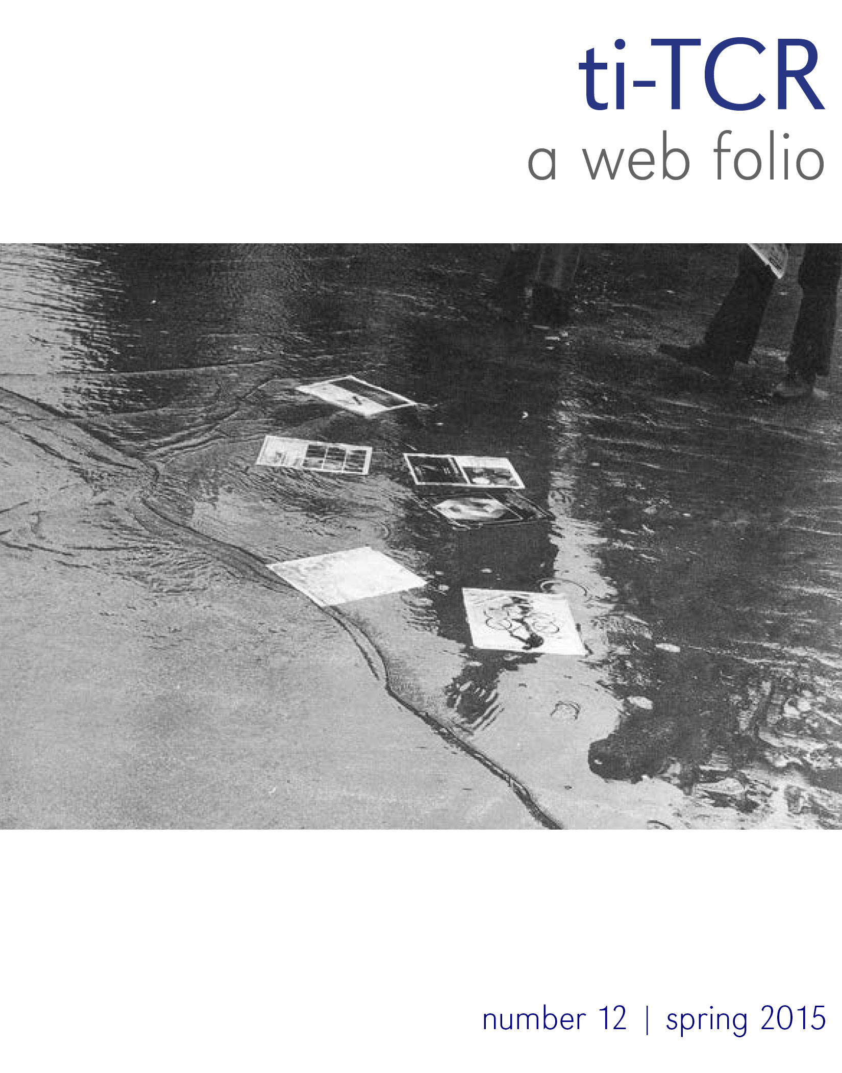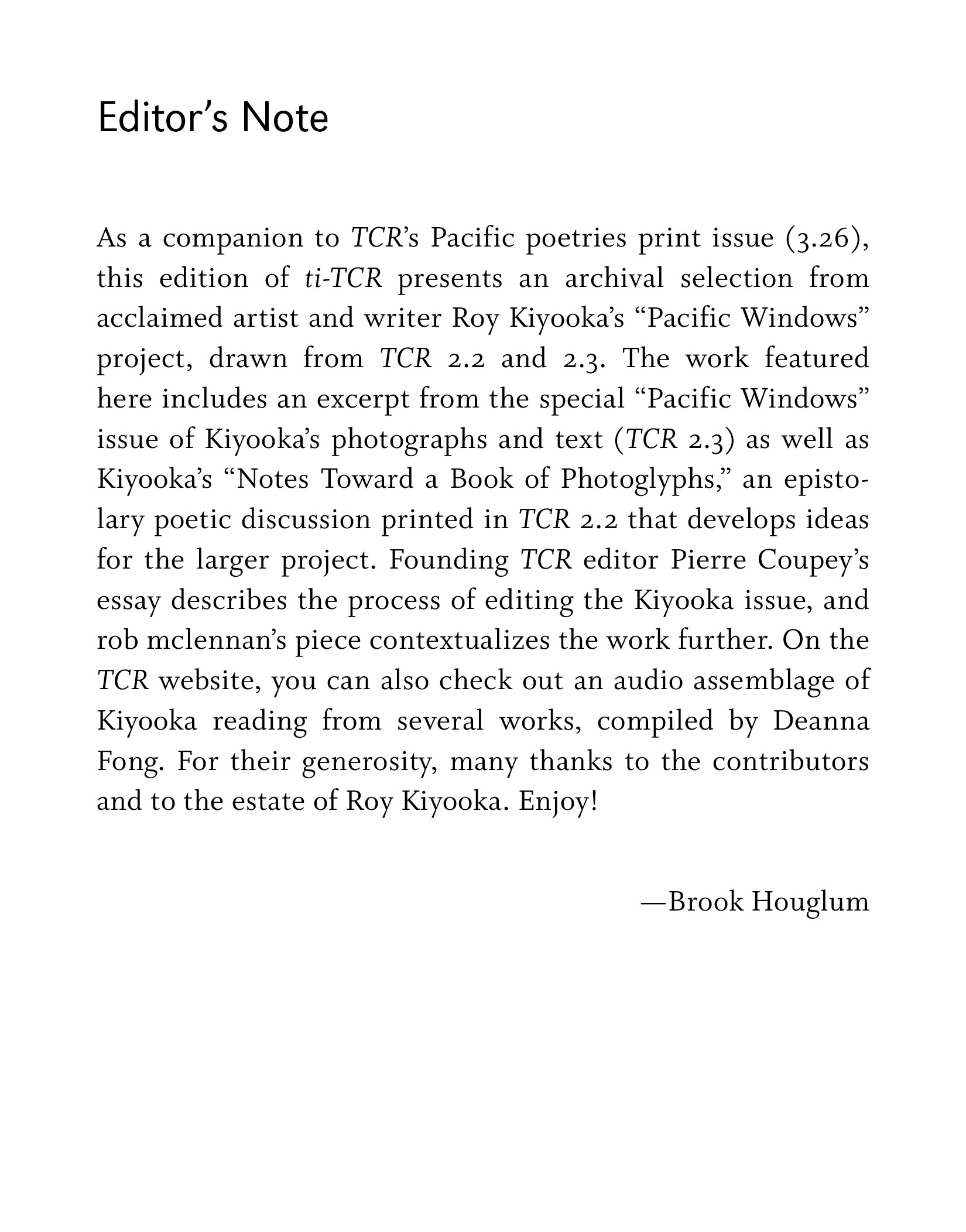 Edited by Brook Houglum and a companion to TCR’s Pacific Poetries print issue (3.26), this edition of ti-TCR presents an archival selection from Roy Kiyooka’s “Pacific Windows” project. Drawn from TCR 2.2 and 2.3, the issue includes an excerpt from the special “Pacific Windows” issue of Kiyooka’s photographs and text as well as Kiyooka’s “Notes Toward a Book of Photoglyphs.” In addition, founding TCR editor Pierre Coupey describes the process of editing the Kiyooka issue, and Rob McLennan contextualizes the work further.