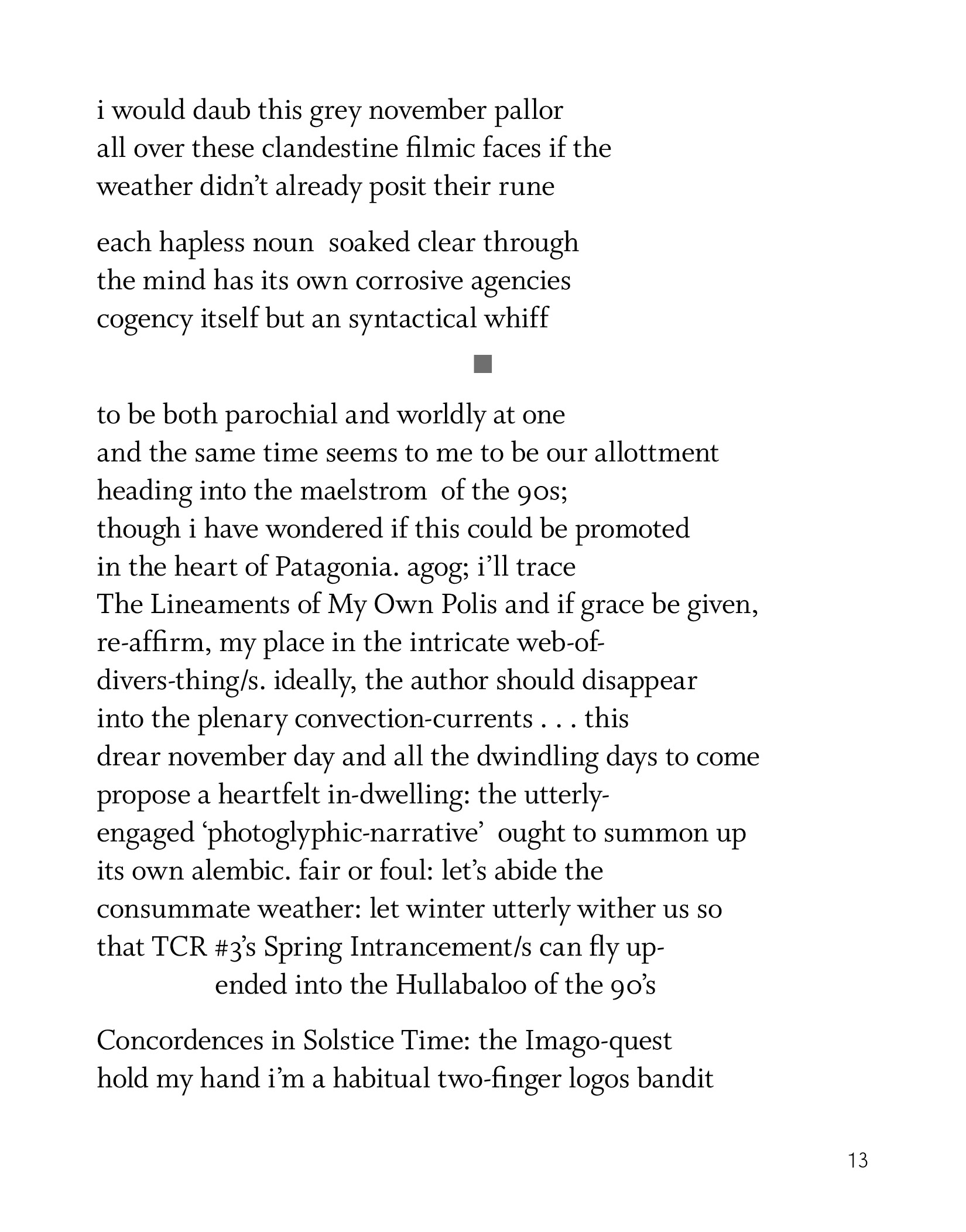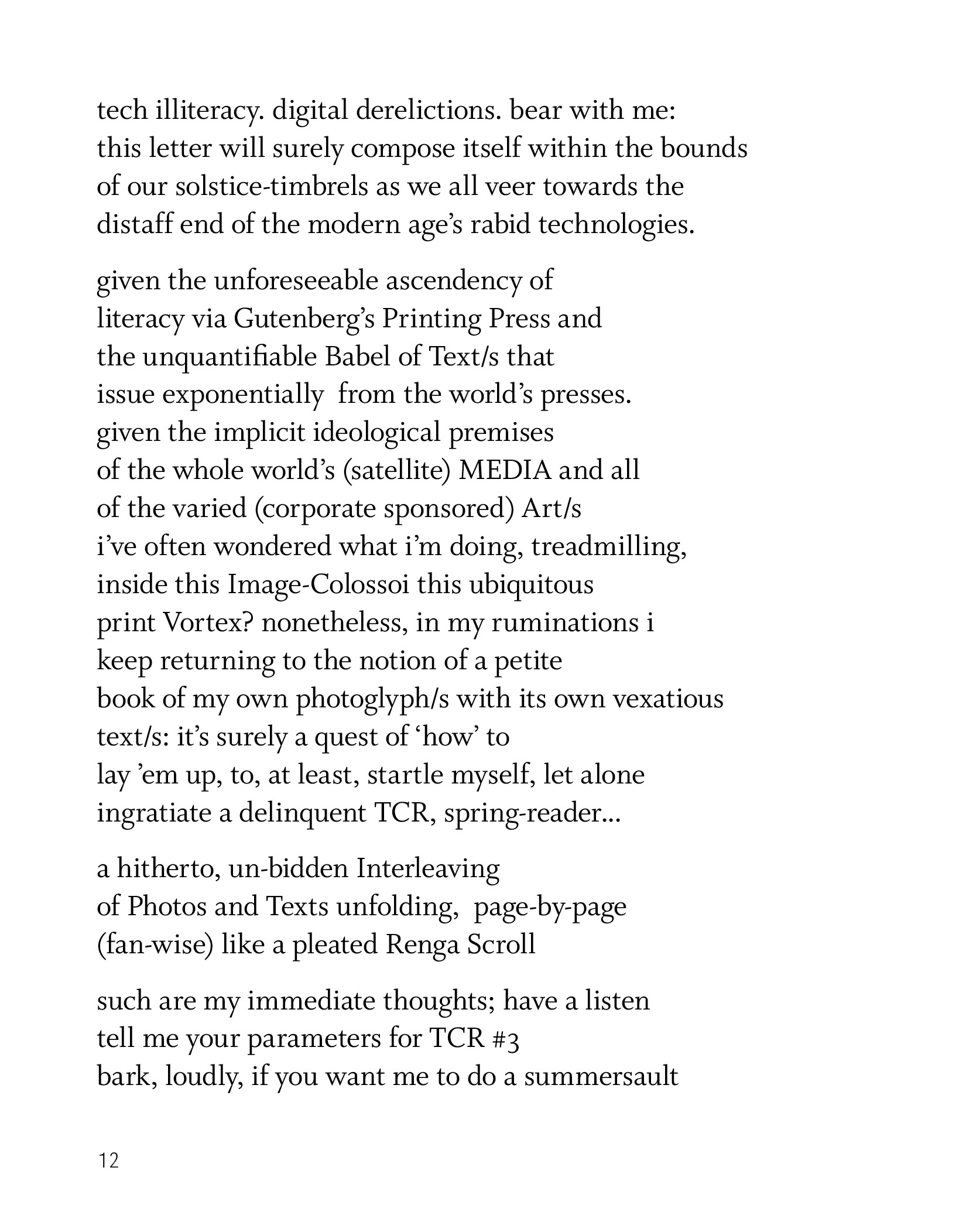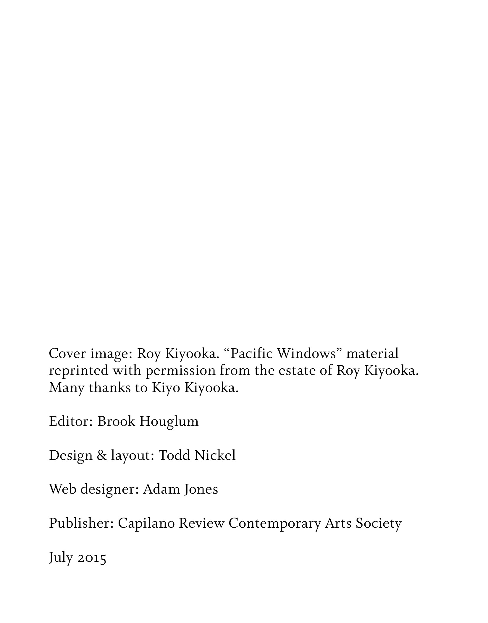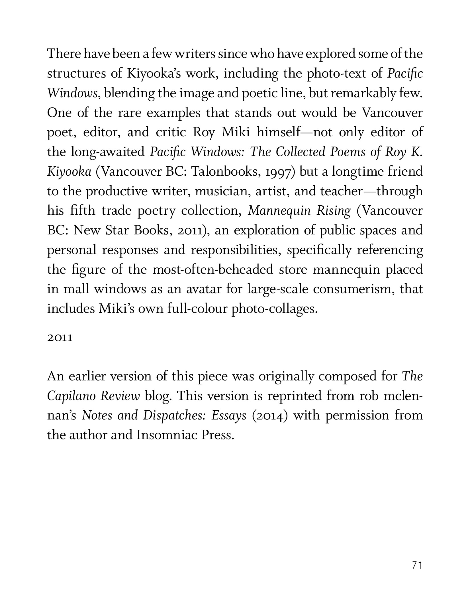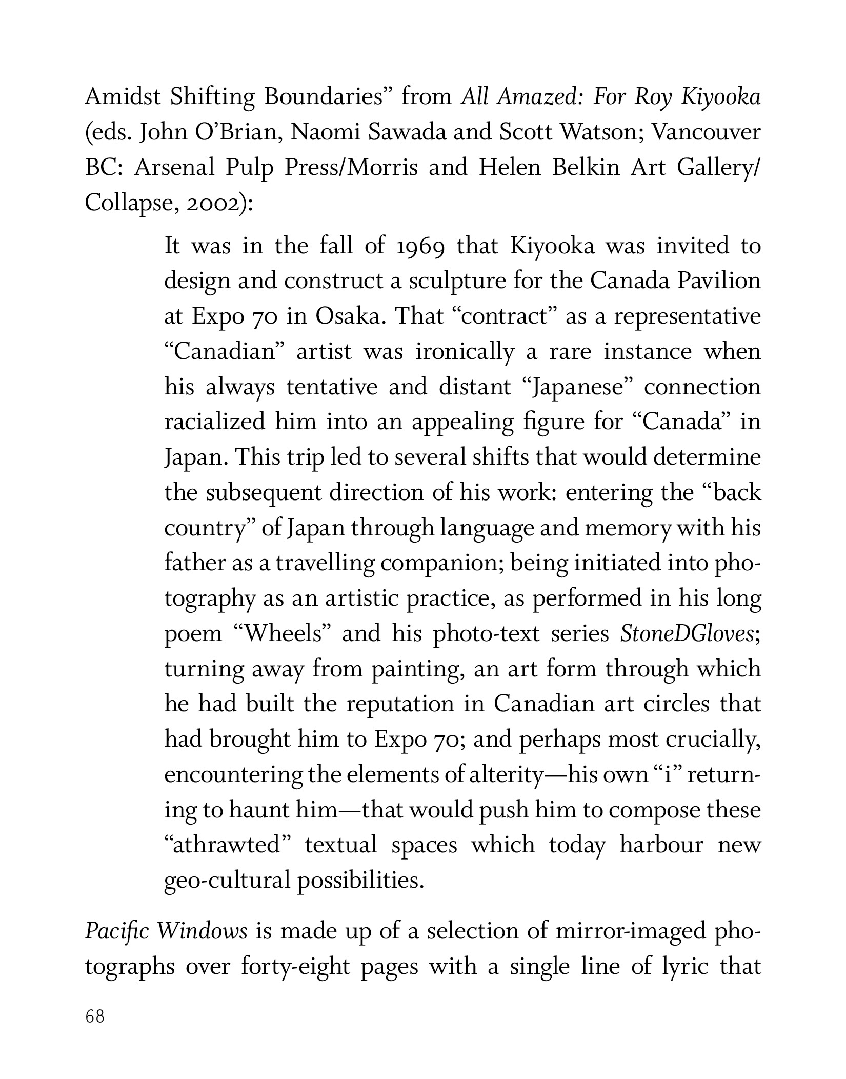 Edited by Brook Houglum and a companion to TCR’s Pacific Poetries print issue (3.26), this edition of ti-TCR presents an archival selection from Roy Kiyooka’s “Pacific Windows” project. Drawn from TCR 2.2 and 2.3, the issue includes an excerpt from the special “Pacific Windows” issue of Kiyooka’s photographs and text as well as Kiyooka’s “Notes Toward a Book of Photoglyphs.” In addition, founding TCR editor Pierre Coupey describes the process of editing the Kiyooka issue, and Rob McLennan contextualizes the work further.